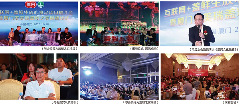 珠海橫琴新區蓋網(wǎng)通傳媒有限公司,香港GNET GROUP 公司董事、總裁鄭永雄先生、廈門(mén)國貿集團董事長(cháng) 何福龍先生、珠海橫琴新區蓋網(wǎng)通傳媒有限公司 香港GNET GROUP教育部總裁 毛凌云先生、蓋粉文化發(fā)展有限公司、蓋粉俱樂(lè )部總監 毛俊廉先生、美美瑞集團董事長(cháng) 劉晴女士、廈門(mén)美美瑞電子科技有限公司董事長(cháng) 張亞才先生、廈門(mén)美美瑞電子科技有限公司總經(jīng)理 孫靖偉先生、廈門(mén)海峽兩岸糖酒協(xié)會(huì )會(huì )長(cháng) 陳耀鵬先生、共同攜手出席本次盛會(huì ),與500余位蓋商、蓋粉歡聚一堂,縱論互聯(lián)網(wǎng)!