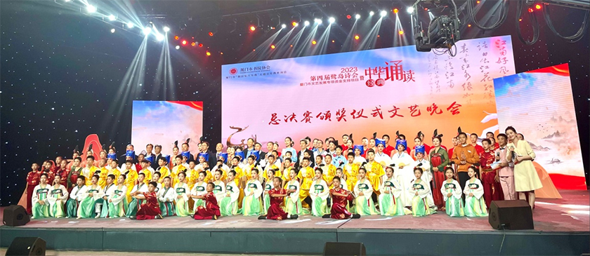 11月18日晚,第四屆“鷺島詩(shī)會(huì )”總決賽暨頒獎儀式文藝晚會(huì )在市廣電1000平演播廳舉行。來(lái)自廈門(mén)實(shí)驗中學(xué)的凌靜雯、廈門(mén)市天安小學(xué)的張蕓菲、廈門(mén)市公園小學(xué)的林嘉誼分別榮獲“金榜題名獎”甲乙丙三個(gè)年齡組“狀元”,廈門(mén)實(shí)驗中學(xué)沈鈺涵獲親子乙組“狀元”,廈門(mén)市海滄區育才小學(xué)林航宇獲親子丙組“狀元”;以及石室書(shū)院等十家單位榮獲團隊組織貢獻——“白鷺騰飛獎”。至此,歷時(shí)近五個(gè)月,近八千位選手參加的第四屆“鷺島詩(shī)會(huì )”圓滿(mǎn)落幕。